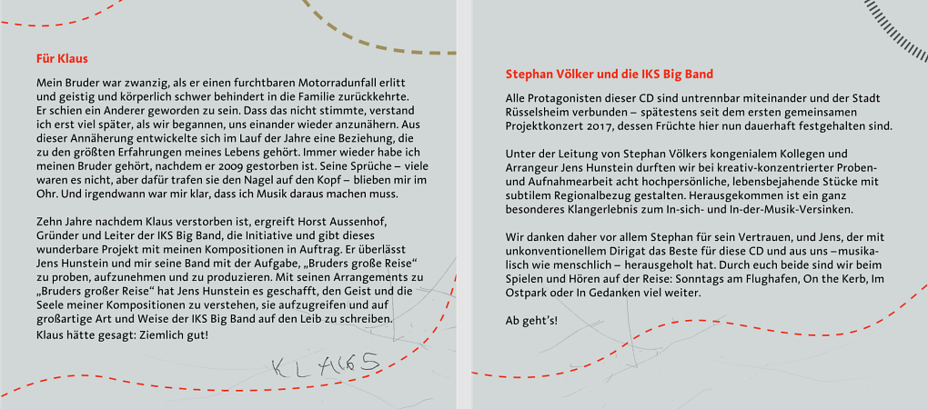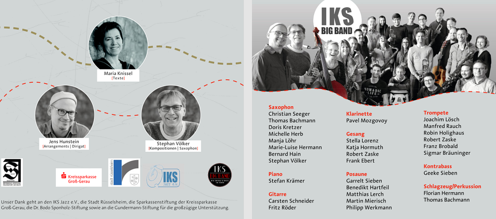Unter der Leitung von Stephan Völker's kongenialem Kollegen und Arrangeur Jens Hunstein durfte die IKS Big Band bei kreativ-konzentrierter Proben- und Aufnahmearbeit acht hochpersönliche, lebensbejahende Stücke mit subtilem Regionalbezug gestalten. Herausgekommen ist ein ganz besonderes Klangerlebnis zum In-sich- und In-der-Musik-Versinken.